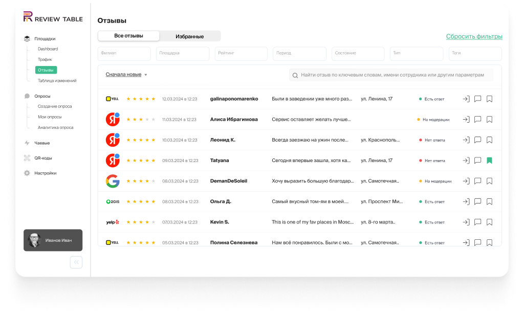 Один из сервисов по работе с отзывами, который заслуживает внимания, — это ReviewTable. Этот инструмент предлагает простоту в использовании, аналитику отзывов и позволяет эффективно управлять репутацией вашей компании в интернете.
